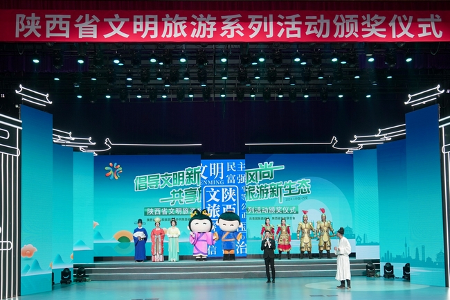 颁奖仪式现场作了精心布置——大屏幕和照片墙展播着“畅游三秦 礼仪先行”征集活动的部分获奖作品,一段段视频、一幅幅照片讲述着文明旅游在三秦大地的深入人心。展示各文明旅游示范单位亮点成果的宣传品,通过城墙“金甲武士”、昆明池“牛郎和织女”、乾陵“唐酒妹和御官儿”、石泉“开心县令”等具有鲜明代表性的文明旅游IP人物向现场观众分发,传递着文明旅游的理念。“冰蛋”“西安导游芥末”等网络达人,则在现场积极向观众们宣传文明旅游。