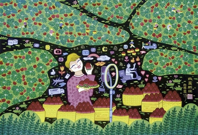 一位漂亮的农村姑娘化身网红主播,把山里的农副特产运上飞机、装入卡车、载上外卖小哥的小电摩……由白瑞雪创作的农民画《致富新经》以直播带货为切入点,表达着新农村的新变化。此外,农民画《文旅融合新征程》,以人物群像的方式展现了旅行团来到民俗村观大戏、品美食、赏美景的热闹景象。《家乡新风貌》则让飞驰的动车组穿越山洞呼啸而过,车水马龙的道路两边是载歌载舞的群众以及他们五彩缤纷的家……