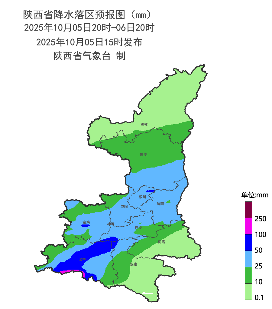 10月5日20时至6日20时主雨带范围缩小,预计西安大部、宝鸡大部、咸阳大部、铜川、渭南大部、延安南部、汉中大部、安康北部部分、商洛北部局地、杨凌示范区有大雨(25~50毫米),其中西安南部局地(周至县)、宝鸡局地(渭滨区)、铜川市东北部局地(宜君县)、汉中大部(汉台区、南郑区、城固县、洋县、勉县、西乡县、镇巴县、宁强县、留坝县、佛坪县)有暴雨(50~100毫米),汉中局地(南郑区、宁强县)有大暴雨(100~130毫米)。上述部分地区伴有短时强降水(最大小时降雨量10~30毫米,个别点40毫米以上)。