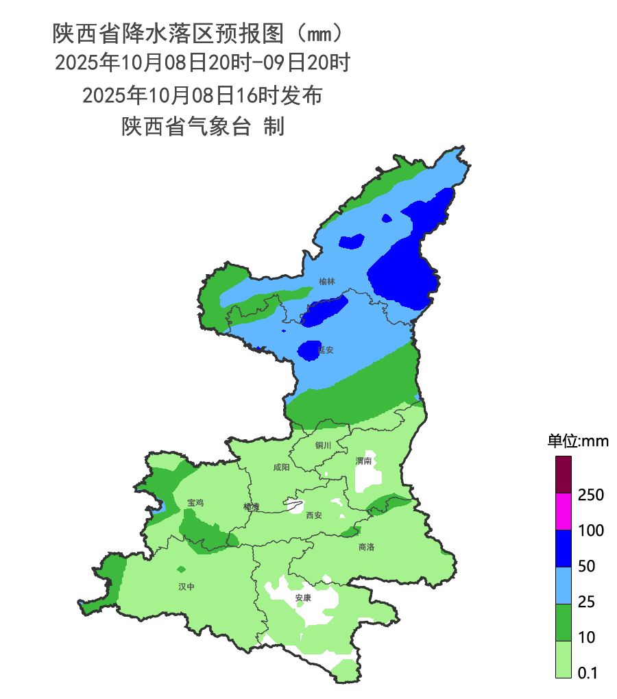 预计10月8日20时至9日20时榆林大部、延安中北部有大雨(25~50毫米),其中榆林东部部分地方(榆阳区、横山区、神木市、府谷县、靖边县、绥德县、米脂县、佳县、吴堡县、清涧县、子洲县)、延安北部局地(安塞区、甘泉县、志丹县、子长市)有暴雨(50~100毫米)。上述部分地区伴有短时强降水(最大小时降雨量10~20毫米)。