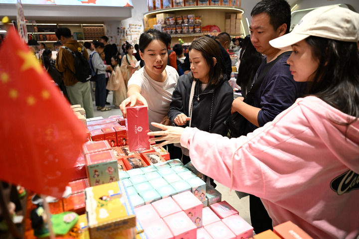 10月2日,游客在大唐不夜城主题文创旗舰店挑选文创产品。