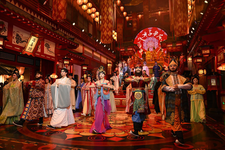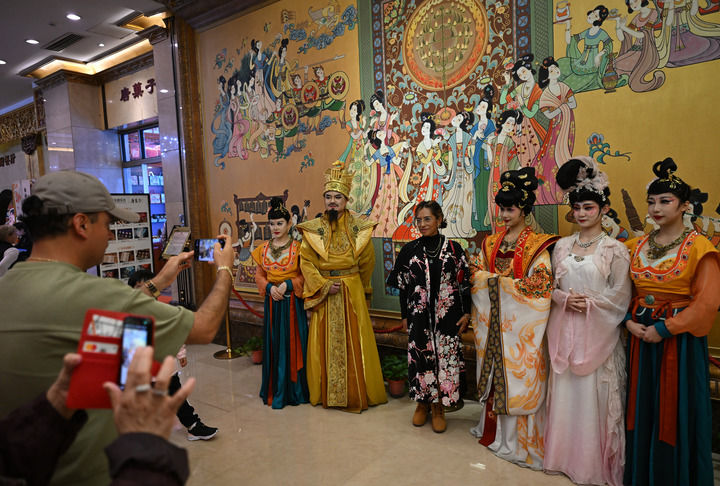 假期期间,位于西安长安北路上的唐乐宫,成了不少外国游客体验中国文化的打卡地。以武则天传奇故事为主线的大型唐宫乐舞《大唐女皇》,融合中国民族乐器、秦腔等传统艺术,复现了“九天阊阖开宫殿,万国衣冠拜冕旒”的盛况,让游客沉浸式感受盛唐文明的辉煌璀璨。