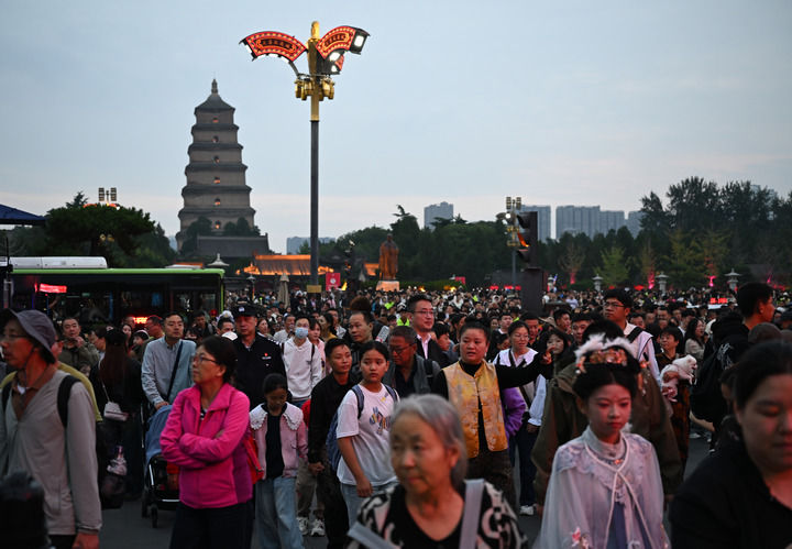 国庆连中秋,陕西又一次迎来旅游热潮:身着汉服的游客围着西安地标钟楼打卡留念,八方游人在大唐不夜城的对诗活动中感叹文化传承,《赳赳大秦》《驼铃传奇》等驻场演艺让历史文化焕发新生,外籍游客登城墙游古城感受中华优秀传统文化魅力……