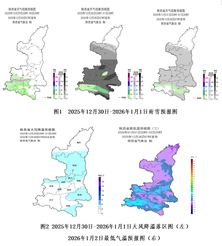 雨雪天气预报:12月30日-1月1日陕北中南部小到中雪,陕北南部局地、关中北部、商洛、秦岭山区小雪或雨夹雪转大雪,关中南部平原小雨或雨夹雪转中到大雪,汉中、安康小雨转雨夹雪或小到中雪。关中北部局地、秦巴山区东段局地有暴雪(图1)。2-6日全省以晴到多云天气为主,4日陕南有弱降水。