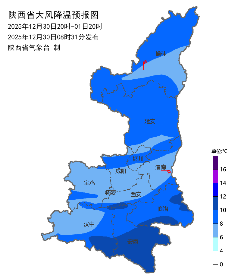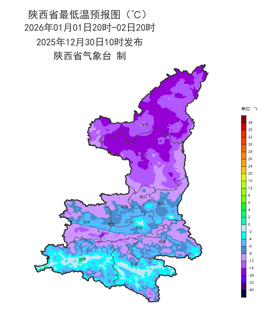 寒潮降温:受寒潮影响,预计 2025 年 12 月 30 日 20 时至2026 年 1 月 1 日 20 时,日平均气温榆林西部和北部、延安大部、关中北部、陕南大部、秦巴山区下降 8~10℃,其中商洛东部和南部(洛南县、山阳县、丹凤县、镇安县)、汉中东部局地(西乡县、镇巴县、佛坪县)、安康南部(汉滨区、汉阴县、宁陕县、紫阳县、岚皋县、平利县、镇坪县、旬阳市、白河县)、秦岭山区(鄠邑区、周至县)可达 10℃以上(以上地区可达寒潮)(图2)。降温后,最低气温预计出现在 2026 年 1 月 2 日清晨,最低气温分布:陕北中北部-20~-12℃,陕北南部-15~-10℃,关中北部、陕南东部、秦巴山区-10~-5℃,关中南部-6~-1℃,陕南河谷地区-4~0℃(图 3)。 30 日夜间至 31 日白天陕北北部有 4 级(5.5-7.9 米/秒)左右偏北风,关中东部、陕南南部、秦巴山区东段有 4 级(5.5-7.9 米/秒)左右偏东风,部分地方阵风可达 6~7 级(10.8-17.1 米/秒)。