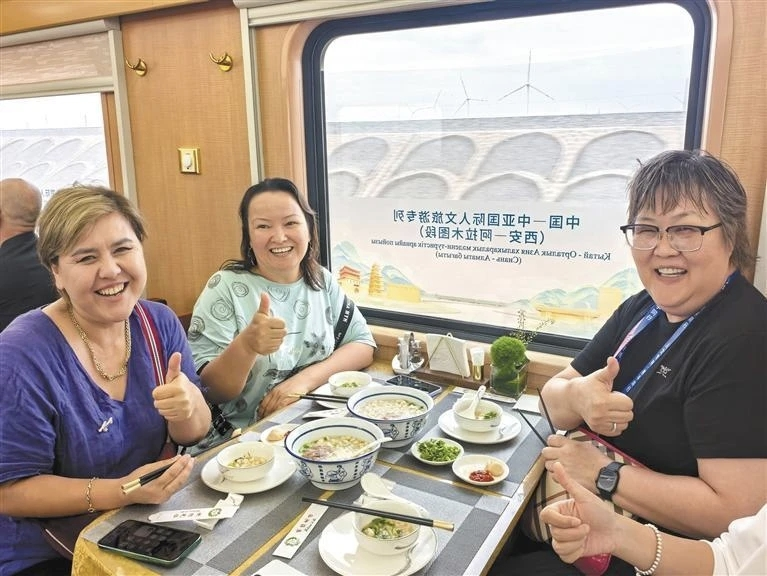 中亚游客搭乘首趟中国—中亚国际人文旅游专列,品尝陕西非遗美食。